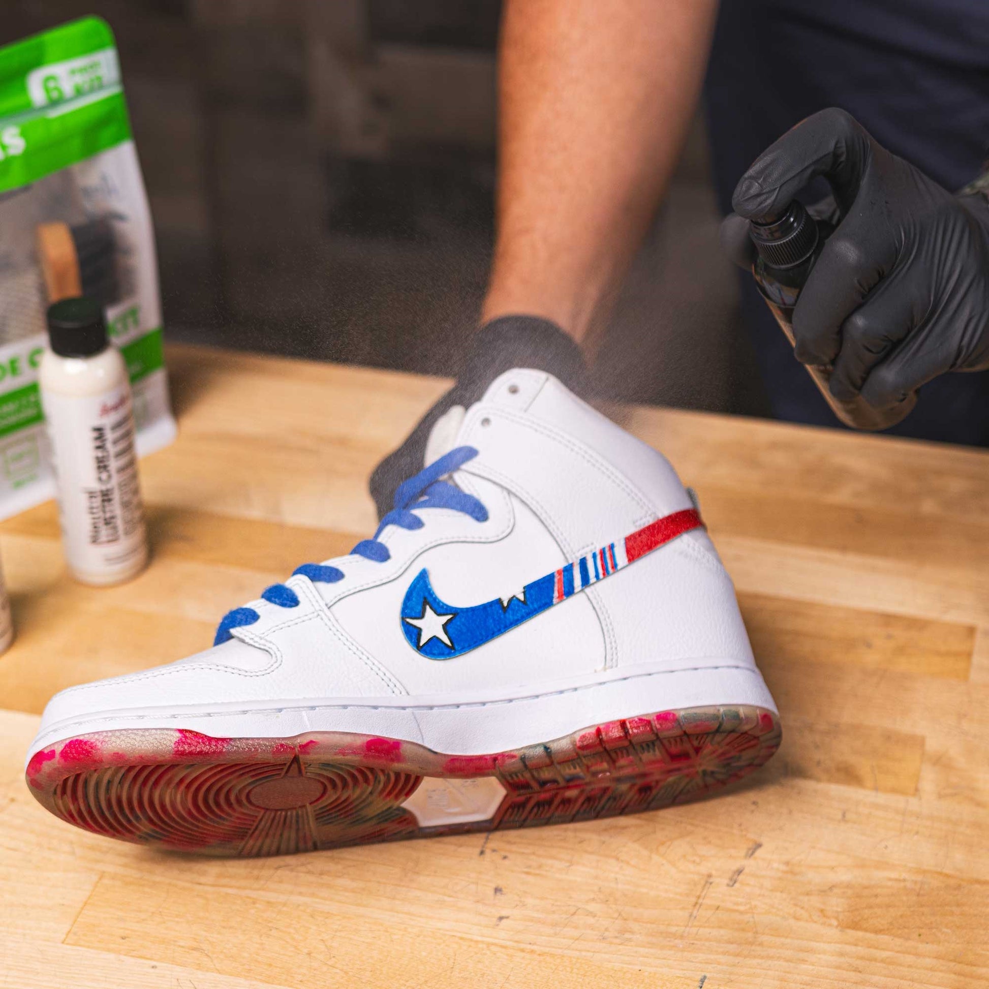 En primer lugar, asegúrese de que el cuero esté completamente pretratado, por ejemplo, con el preparador y decapante de Angelus.